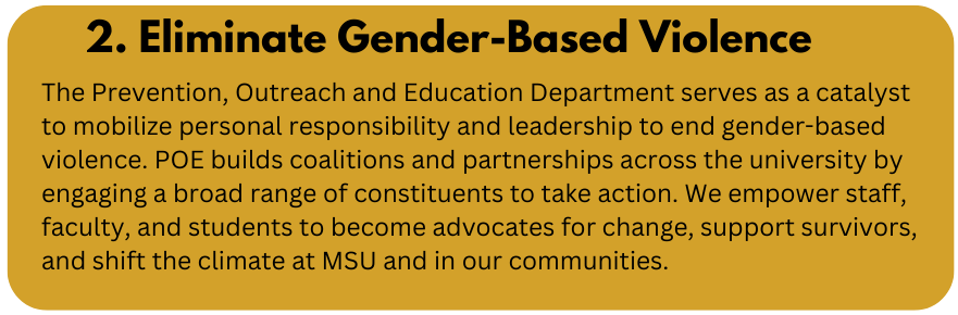 - Creating specialized Relationship Violence and Sexual Misconduct (RVSM) prevention training for MSU Health Care to ensure the safety of faculty, staff, students, and patients.