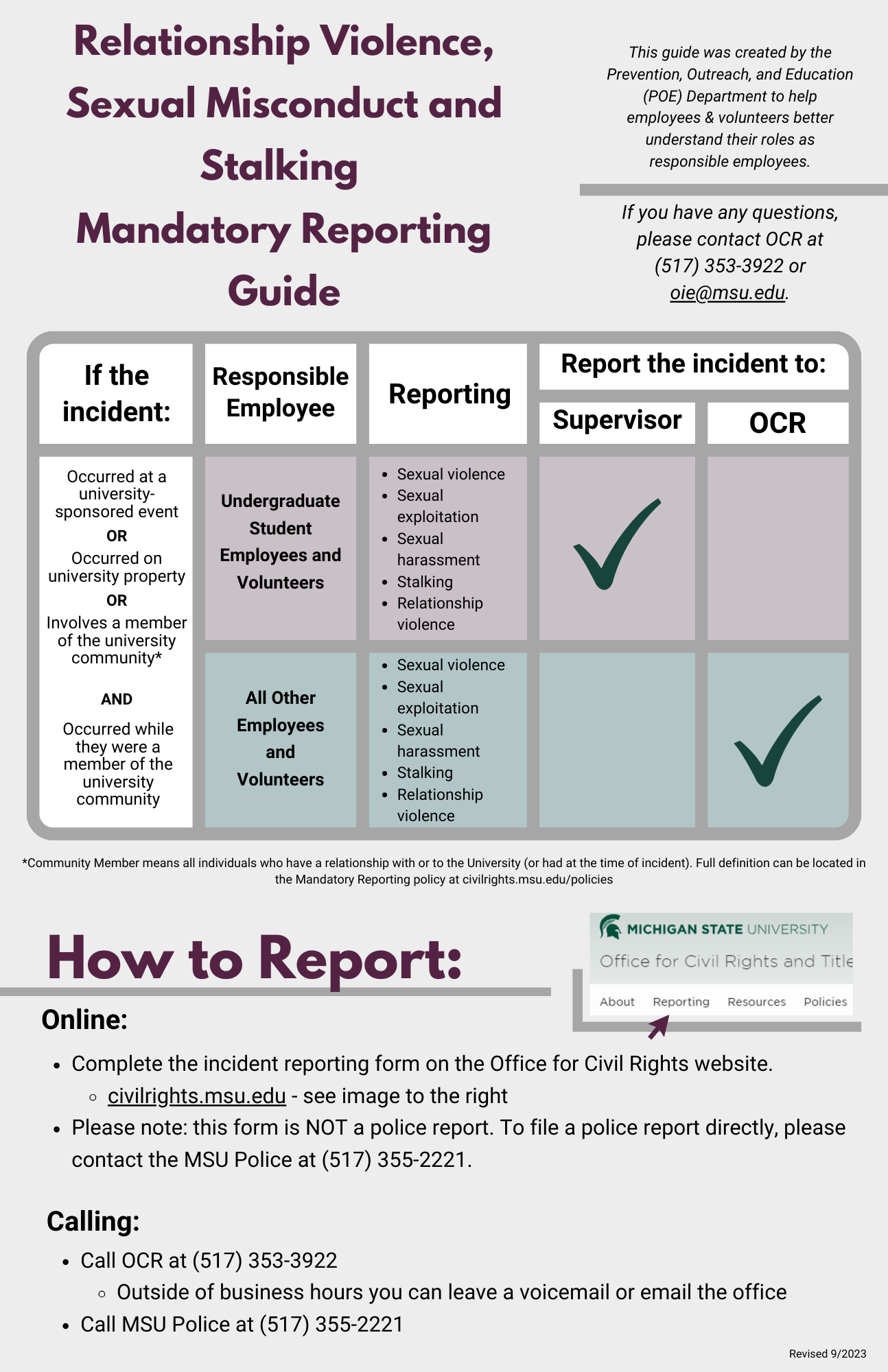 If you have any questions about reporting, please contact POE at (517) 355-3865 or empower@msu.edu.