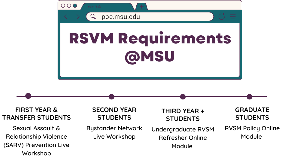All undergraduate students at MSU participate in mandatory Relationship Violence & Sexual Misconduct prevention trainings. First-year and transfer students are asked to complete the SARV or Sexual Assault and Relationship Violence prevention workshop, second-year students participate in Bystander Network, third-year and above students as well as graduate students participate in online modules each year they are a student at MSU. As you move through your MSU journey, you'll participate in other workshops based on your academic class standing as illustrated in the chart below. The SARV Prevention and Bystander Network workshops are facilitated in person or live by POE Peer Educators.